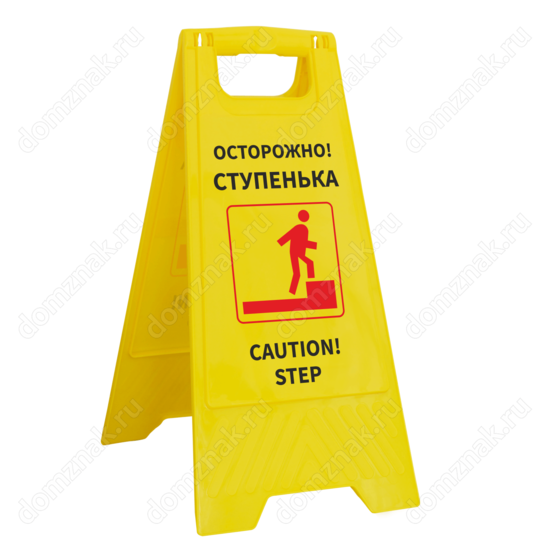Предупредите персонал и гостей вашего заведения о ступеньке, о которую можно споткнуться. Купите и установите табличку на пол «Осторожно, ступенька». Она привлечет внимание и поможет избежать травм. На поверхности таблички нанесена контрастная надпись на русском и английском языках, которая подкреплена информативным рисунком. Для переноски табличка оборудована удобной ручкой. Устанавливается она в раскрытом состоянии в зоне нахождения ступеньки.