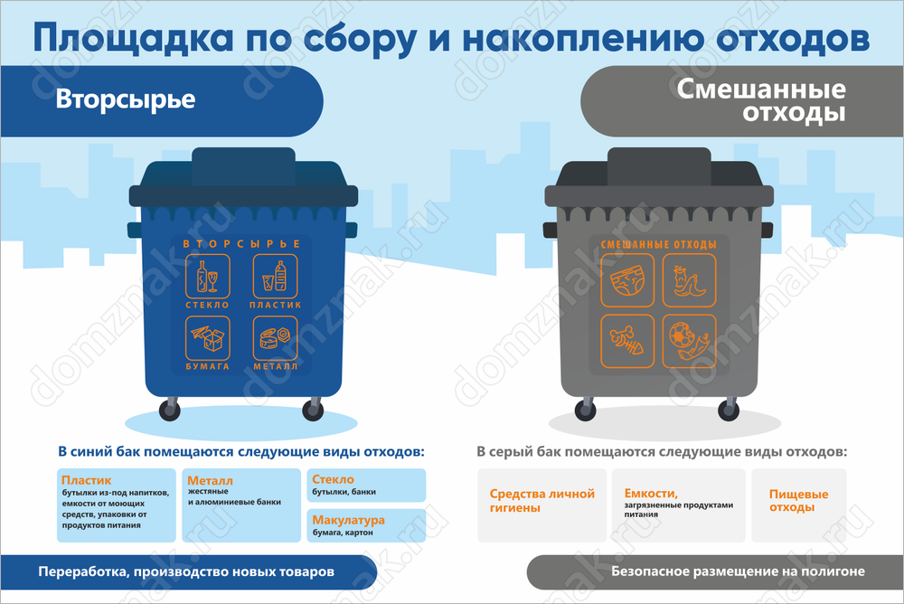 Табличка «Площадка по сбору и накоплению отходов» изготавливается на основе из пластика ПВХ или оцинкованного металла.