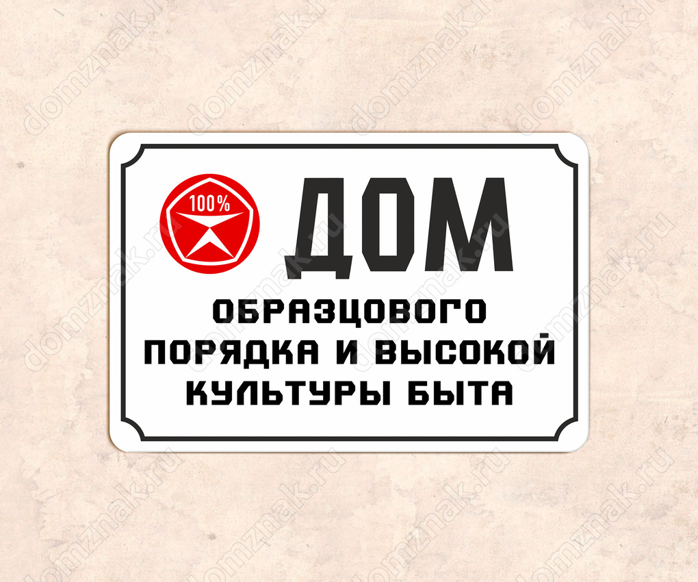 Табличка «Дом образцового порядка и высокой культуры быта» изготовлена из пластика ПВХ, толщиной 4 мм. Изображение наносится по технологии УФ-печати. Табличка предназначена для использования как в помещении, так и на улице.