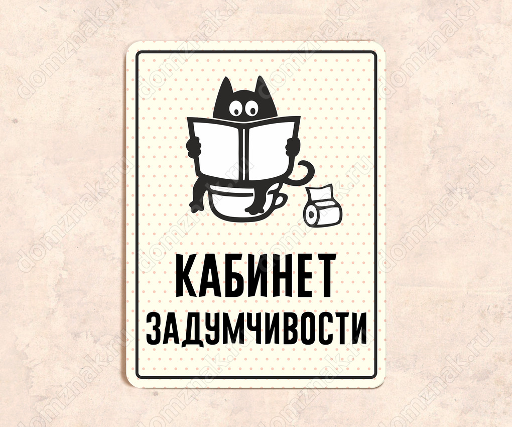 Табличка «Кабинет задумчивости» изготовлена из пластика ПВХ, толщиной 4 мм. Изображение наносится по технологии УФ-печати. Табличка предназначена для использования как в помещении, так и на улице.