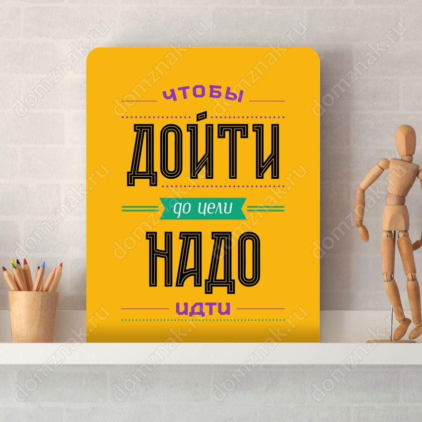 Табличка «Чтобы дойти до цели нужно идти» изготовлена из пластика ПВХ, толщиной 4 мм. Изображение наносится по технологии УФ-печати. Табличка предназначена для использования как в помещении, так и на улице.