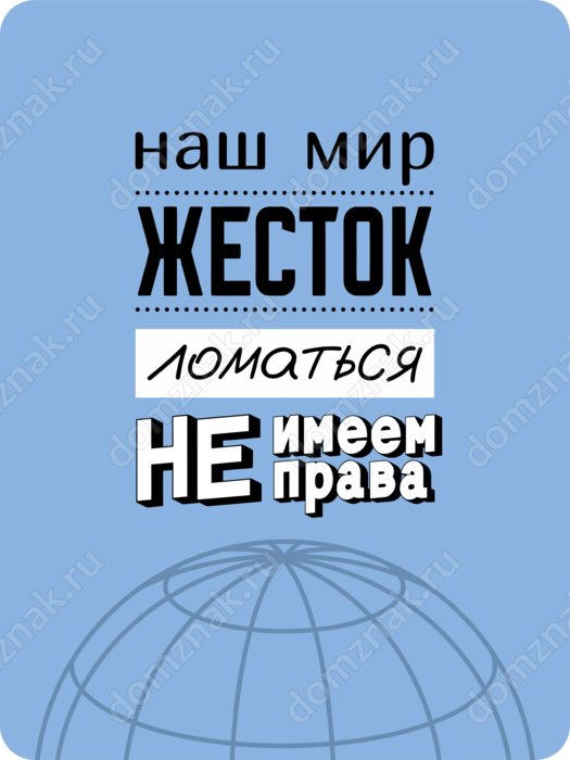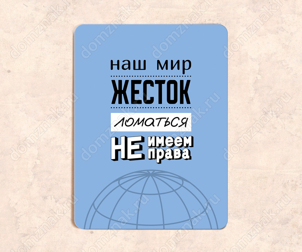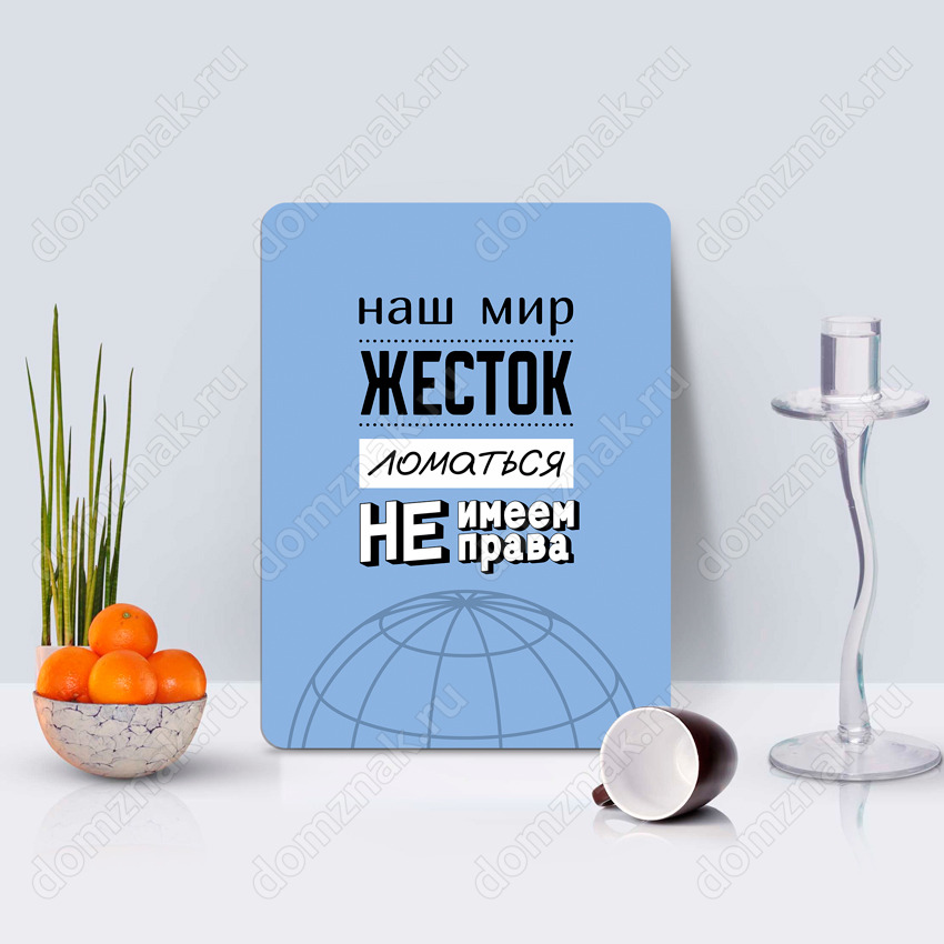Табличка «Наш мир жесток ломаться не имеем права» изготовлена из пластика ПВХ, толщиной 4 мм. Изображение наносится по технологии УФ-печати. Табличка предназначена для использования как в помещении, так и на улице.