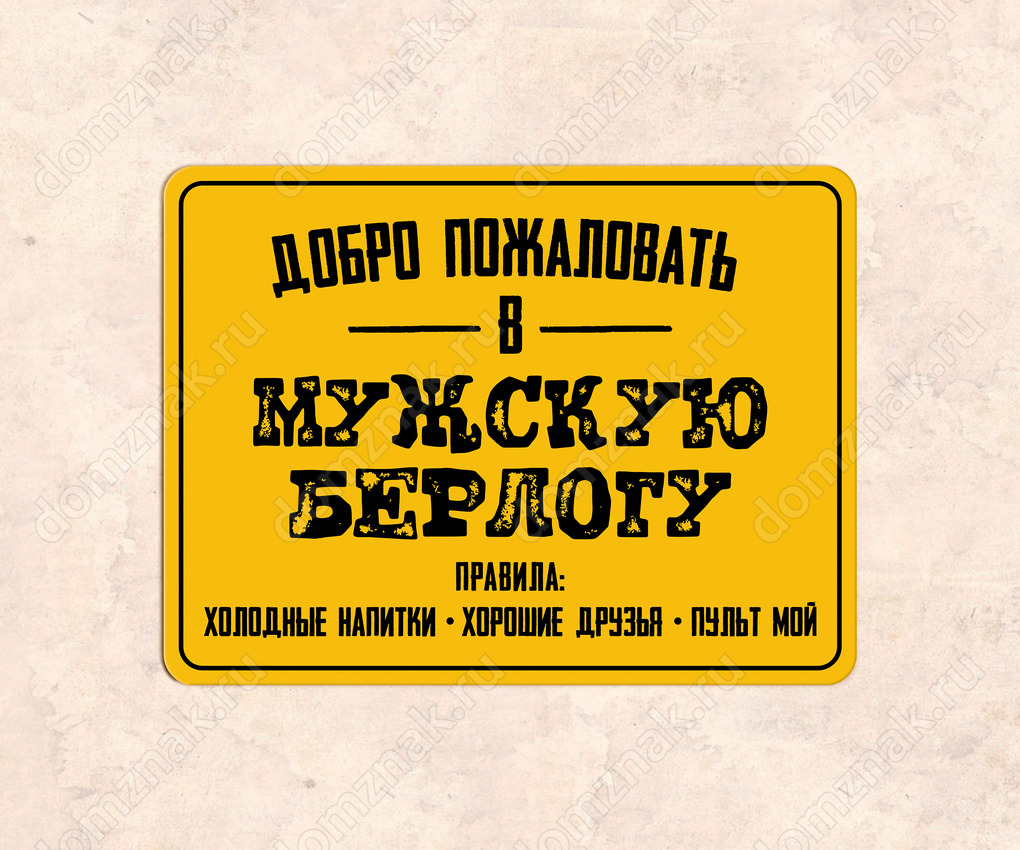 Табличка «Добро пожаловать в мужскую берлогу. Правила: холодные напитки, хорошие друзья, пульт мой»